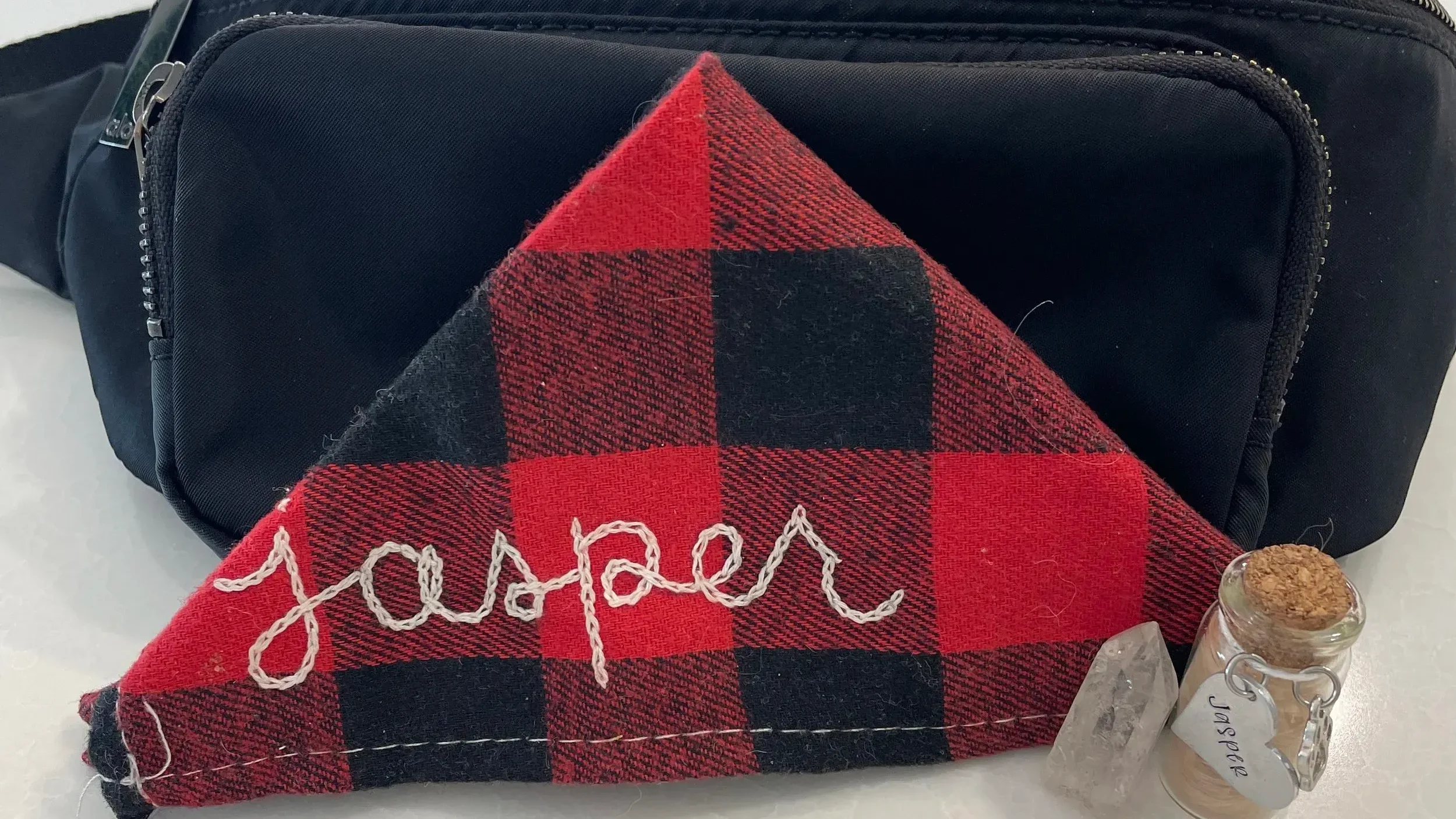 So I started carrying a small pouch with me — everywhere. It lives in my fanny pack or whatever bag I’m using at the moment. Inside is Jasper’s favorite bandana, a tiny glass jar someone gifted me, filled with a little of his hair and a crystal.